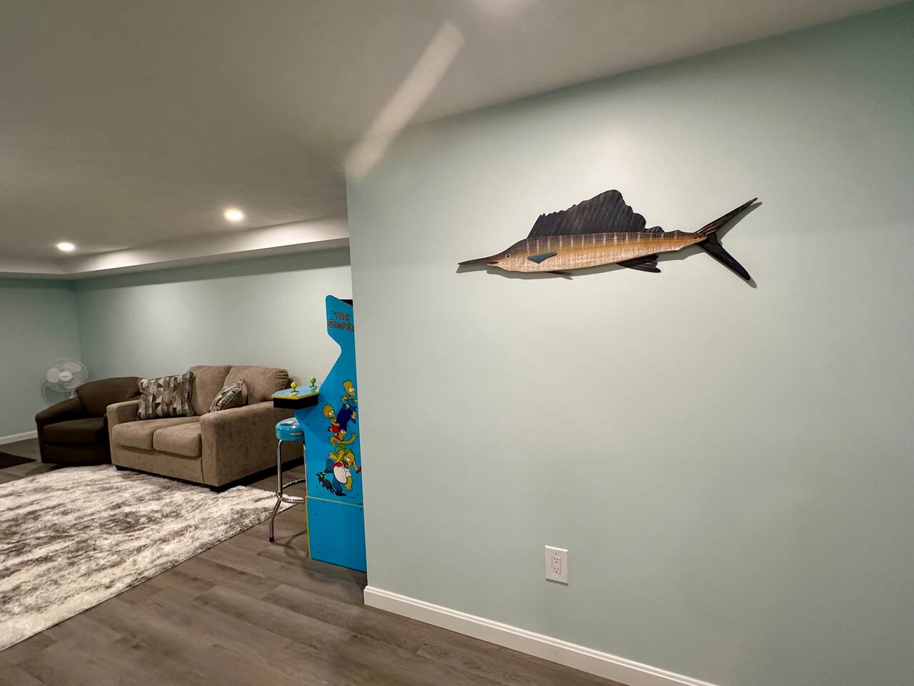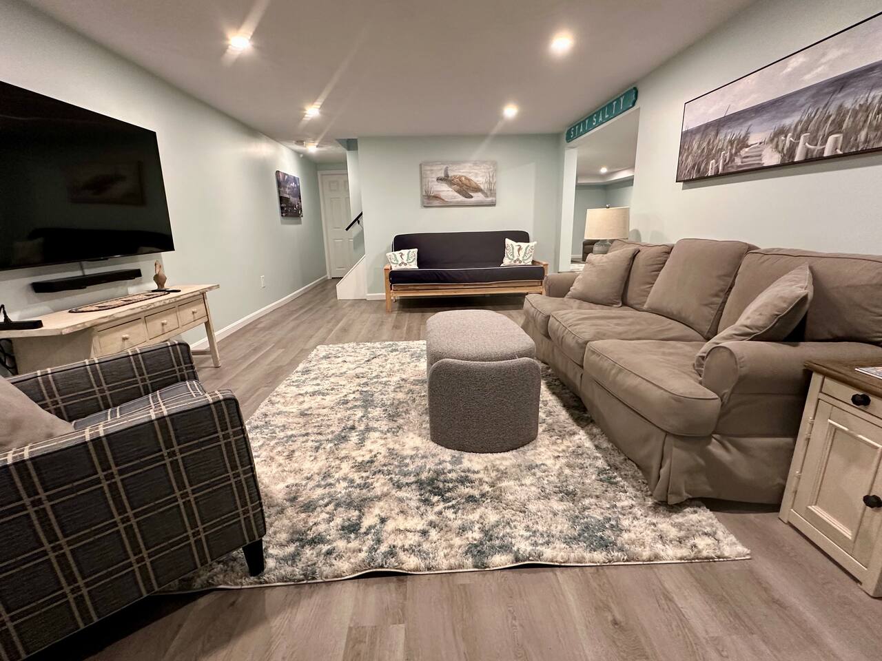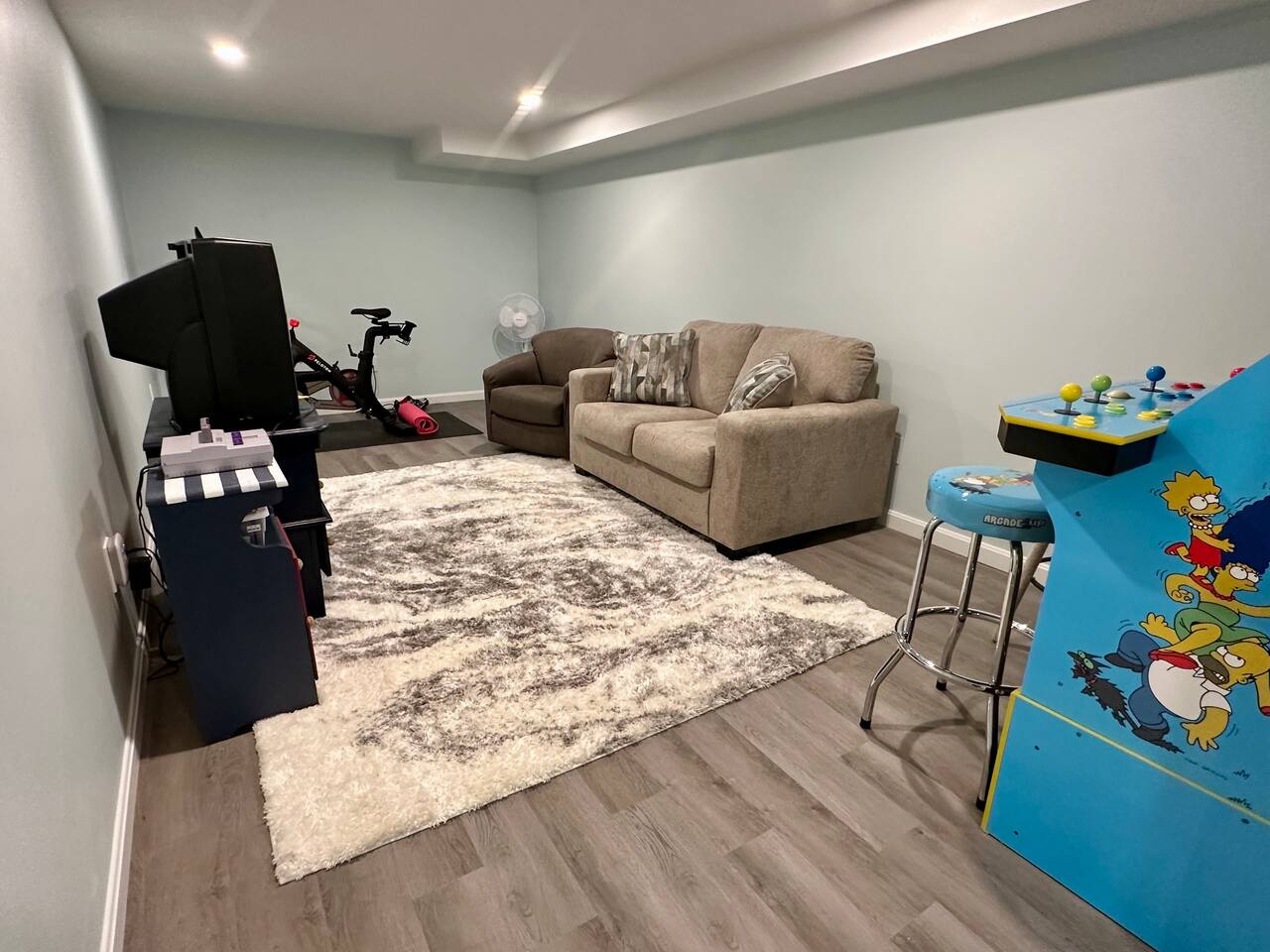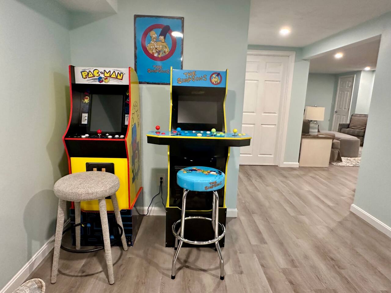 Primary bedroom: 1 king bed, private full bath, 43" smart tv & closet Bedroom 2: 1 queen bed, 50" smart tv, closet Bedroom 3: 1 full bed, twin bunk beds, 43" smart tv, closet *NEW AS OF SUMMER ‘24* FINISHED BASEMENT- features a full living/family room with a 65” Smart TV and Bose Speaker system. There is a pull out futon in this space. The media room features a 2 seater couch, chair, PELOTON, ARCADE 1 GAMES, and an older TV that works best for retro gaming systems (Super Nintendo w/a bunch of great games included!!)